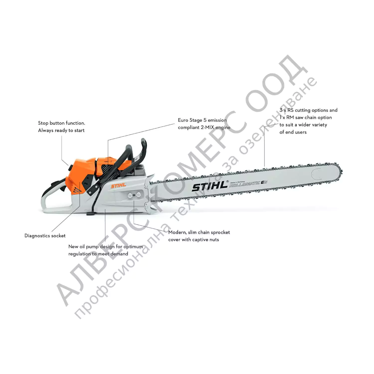 - С двигател 2-MIX на STIHL за висока производителност при рязане и мощност, съчетани с ефективно оползотворяване на горивото.