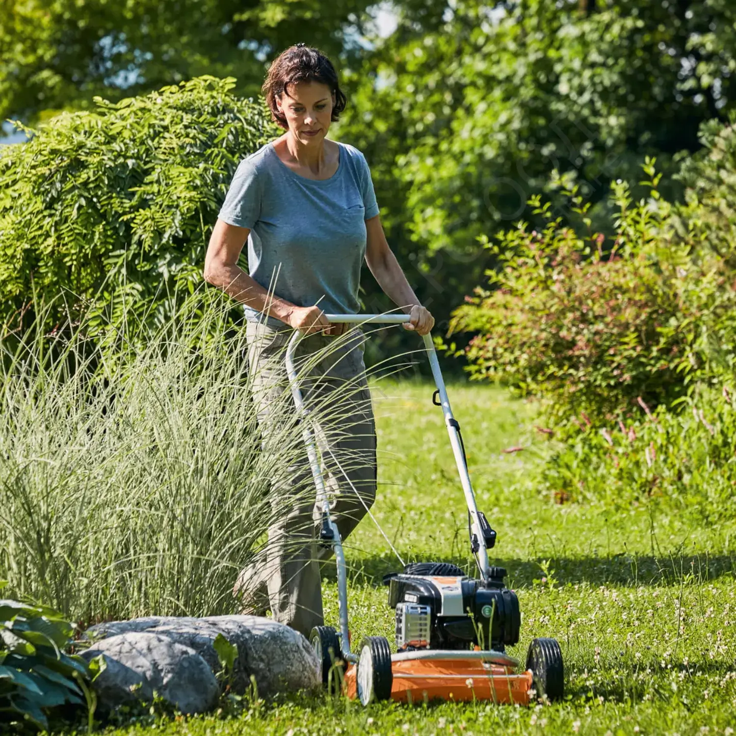 - Със специално оформения нож за мулчиране фината окосена маса пада директно върху окосеният участък. Това допринася за поддръжката на трайно зелени тревни площи, тъй като изпълнява функцията на естествена богата на хранителни вещества тор.