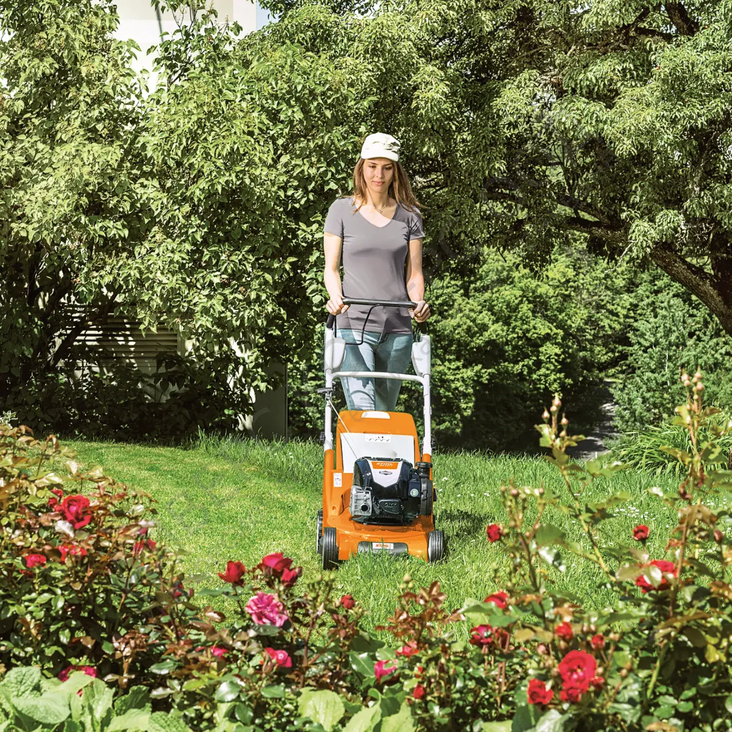 - Компактната, здрава и ефективна бензинова косачка STIHL RM 545 T с ширината си на косене от 43 см е много подходяща за поддръжка на средно големи тревни площи.